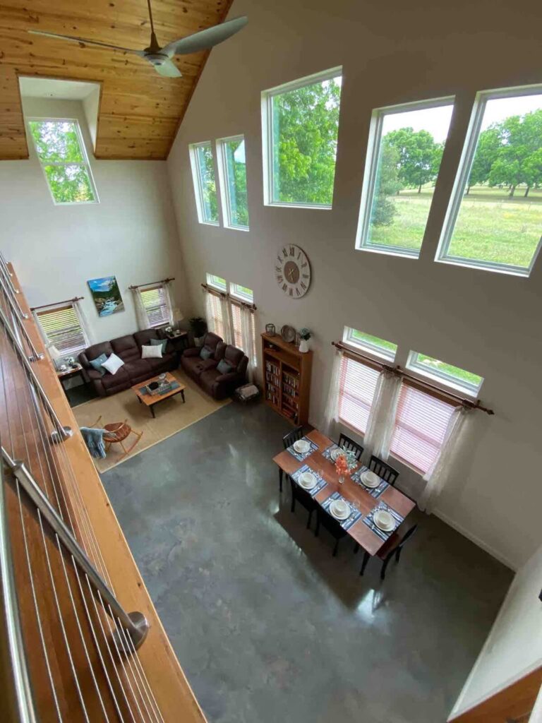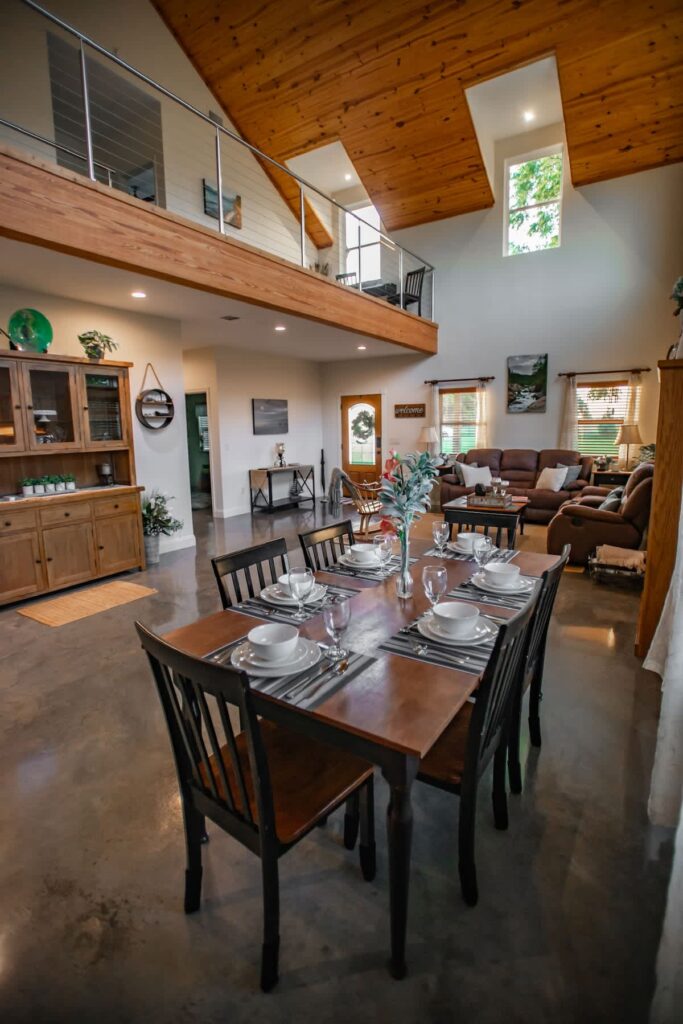 House is well decorated in the modern farmhouse style. Living area has two couches and a rocker so everyone can relax together. Upstairs loft area is perfect for enjoying the view, or curling up with a book. Kitchen is fully stocked with cookware, cutlery and glassware and dining area has a beautiful handcrafted table and 6 chairs. There is also outdoor seating and a table on the covered back porch, as well as a fire pit for guests to use.